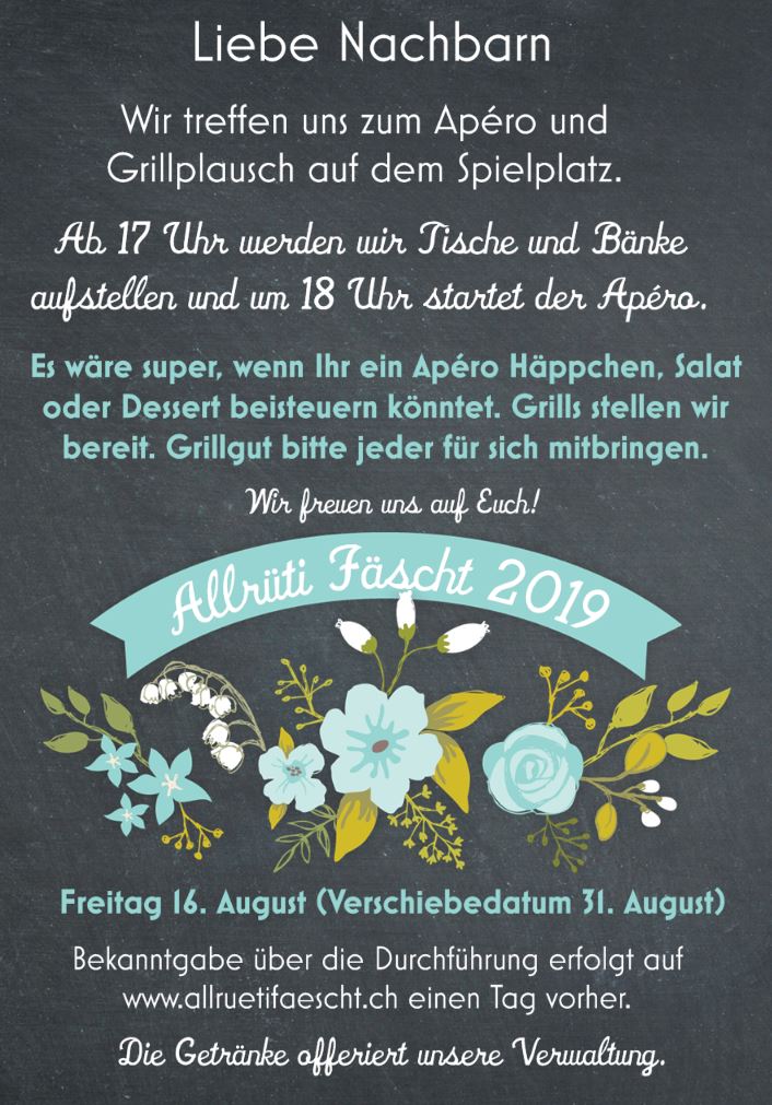 Das Allrüti Fäscht findet definitv am Freitag 16. August 2019, wie geplant statt. 15:00 Kinderspiele 17:00 Bänke aufstellen, Helfer sind immer willkommen. 18:00 Apéro und Grillplausch Bitte Grilladen, Geschirr, Gläser und Becher jeder für sich mitbringen.